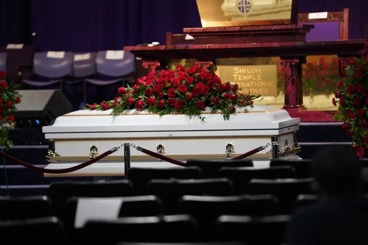 A mourner stands before the casket of Daunte Wright during a wake at Shiloh Temple International Ministries church.